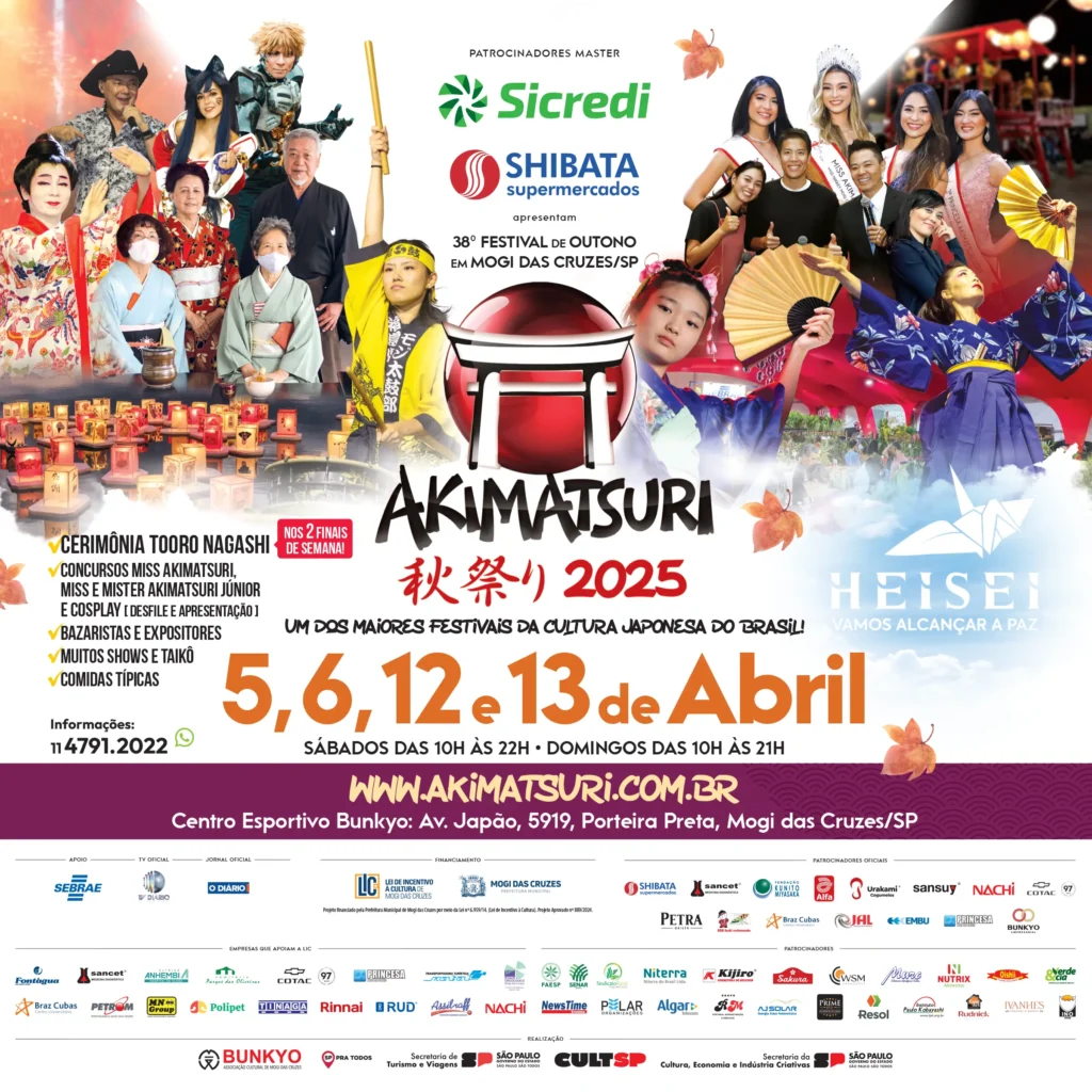 Nos dias 5, 6, 12 e 13 de Abril de 2025, o ⛩️ 38º Festival de Outono Akimatsuri 2025 ⛩️ promete encantar e surpreender, consolidando-se como um dos maiores festivais da cultura japonesa do Brasil. Realizado em dois finais de