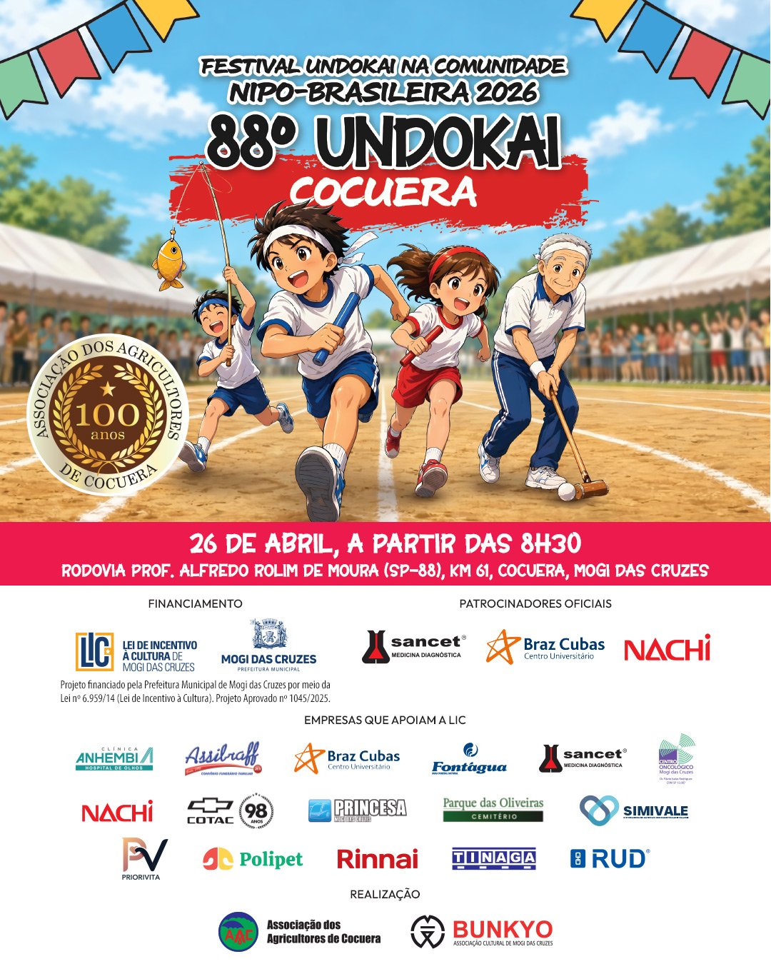 Festival Undokai na Cultura Nipo-Brasileira 2026 88º Undokai de CocueraData: 26 de abril de 2026A partir das 8h30 Local: Rodovia Prof. Alfredo Rolim de Moura (SP-88),Km 61, Cocuera, Mogi das Cruzes