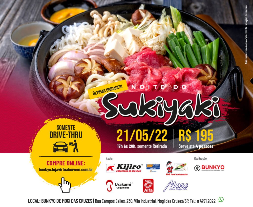 Esse friozinho combina demais com o tradicional e delicioso 𝗦𝘂𝗸𝗶𝘆𝗮𝗸𝗶 𝗱𝗼 𝗕𝘂𝗻𝗸𝘆𝗼 𝗱𝗲 𝗠𝗼𝗴𝗶 𝗱𝗮𝘀 𝗖𝗿𝘂𝘇𝗲𝘀, que será realizado no dia 𝟮𝟭 𝗱𝗲 𝗺𝗮𝗶𝗼 𝗱𝗲 𝟮𝟬𝟮𝟮, somente pelo sistema de 𝗗𝗿𝗶𝘃𝗲-𝗧𝗵𝗿𝘂 (𝗥𝗲𝘁𝗶𝗿𝗮𝗱𝗮). Adquira já seu convite, quantidade limitada! 𝗩𝗲𝗻𝗱𝗮 𝗱𝗲 𝗰𝗼𝗻𝘃𝗶𝘁𝗲𝘀: Bunkyo de Mogi das Cruzes 𝗩𝗲𝗻𝗱𝗮 𝗱𝗲 𝗰𝗼𝗻𝘃𝗶𝘁𝗲𝘀 𝗼𝗻𝗹𝗶𝗻𝗲: https://bunkyo.lojavirtualnuvem.com.br/produtos/noite-do-sukiyaki-do-bunkyo-de-mogi-das-cruzes-21-05-2022 O Kit do Sukiyaki é […]