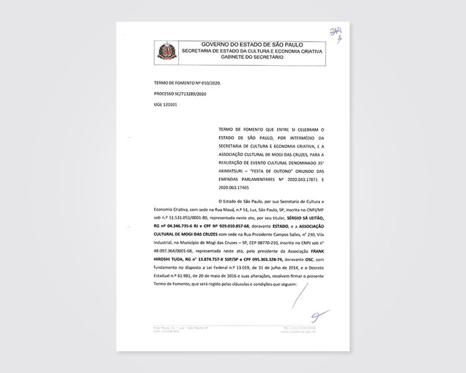 Termo de Fomento que entre si celebram o Estado de São Paulo, por intermédio da Secretaria de Cultura e Economia Criativa, e a Associação Cultural de Mogi das Cruzes, para a realização de evento cultural denominado 35º Akimatsuri – “Festa de Outono” oriundo das emendas parlamentares nº 2020.043.17871 e 2020.063.17465.